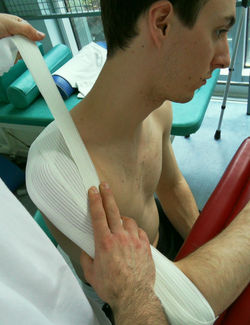![]() Bande effectriceElles sont au nombres de 3 (6cm de largeur), une pour chaque chef du deltoïde. La pose se fait sans tension jusqu'au V deltoïdien, puis avec une tension importante jusqu'à l'embase proximale. L'élasticité des bandes peut être "cassée" au préalable afin d'améliorer la tenue dans le temps du strap. | ![]() | ![]() deuxième bande effectrice |